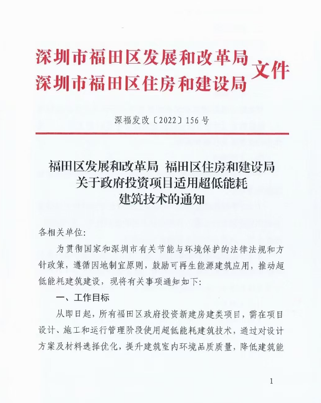 近日,广东省深圳市福田区发改局、福田区住建局联合印发《关于政府投资项目适用超低能耗建筑技术的通知》,通知要求,从即日起,所有福田区政府投资新建房建类项目(截至通知印发之日已成功申报概算审批的项目除外),需在项目设计、施工和运行管理阶段使用超低能耗建筑技术,通过对设计方案及材料选择优化,提升建筑室内环境品质质量,降低建筑能耗,实现超低能耗建筑要求。