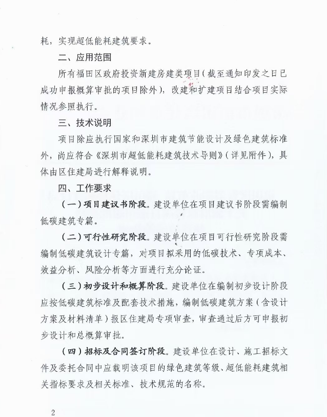 近日,广东省深圳市福田区发改局、福田区住建局联合印发《关于政府投资项目适用超低能耗建筑技术的通知》,通知要求,从即日起,所有福田区政府投资新建房建类项目(截至通知印发之日已成功申报概算审批的项目除外),需在项目设计、施工和运行管理阶段使用超低能耗建筑技术,通过对设计方案及材料选择优化,提升建筑室内环境品质质量,降低建筑能耗,实现超低能耗建筑要求。 改建和扩建项目结合项目实际情况参照执行。 全文如下: