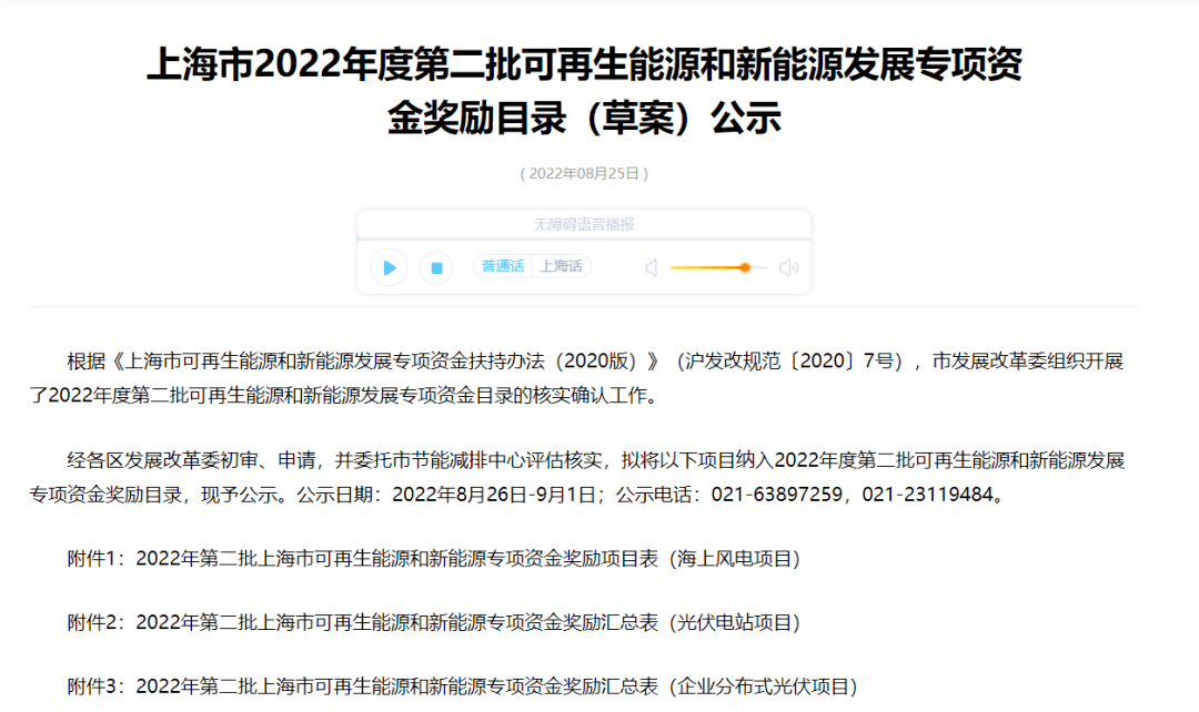 8月25日,上海市2022年度第二批可再生能源和新能源发展专项资金奖励目录(草案)公示。