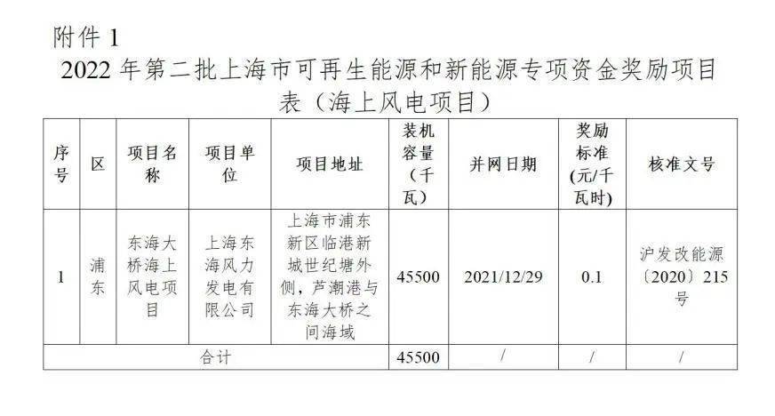 附件1:2022年第二批上海市可再生能源和新能源专项资金奖励项目表(海上风电项目)
