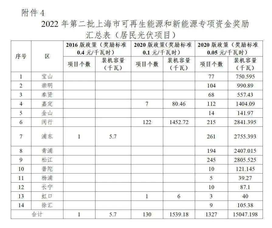 附件4:2022年第二批上海市可再生能源和新能源专项资金奖励汇总表(居民光伏项目)