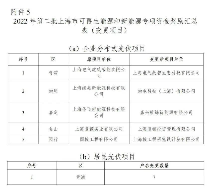 附件5:2022年第二批上海市可再生能源和新能源专项资金奖励汇总表(变更项目)