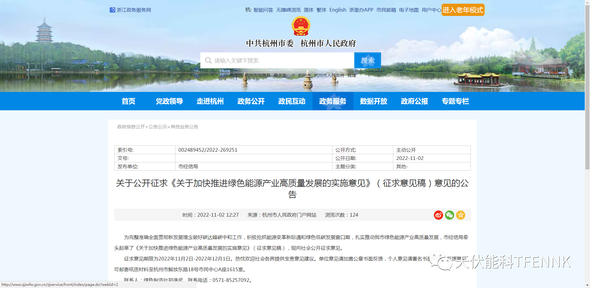 11月2日,杭州市人民政府网发布关于公开征求《关于加快推进绿色能源产业高质量发展的实施意见》(征求意见稿)意见的公告。