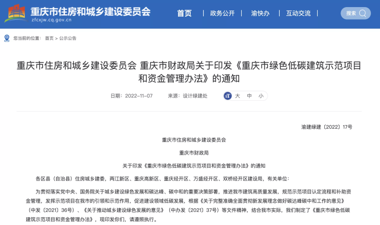 11月9日,为促进建设领域绿色低碳发展,发挥示范项目在重庆市的引领和带动作用,日前,重庆市住房城乡建委与重庆市财政局共同出台了《重庆市绿色低碳示范项目和资金管理办法》(以下简称《办法》)。根据《办法》,重庆将对绿色建筑示范项目、近零能耗建筑示范项目、可再生能源区域集中供冷供热示范项目及既有公共建筑绿色化改造示范项目给予财政补助资金,最高补助1500万元。